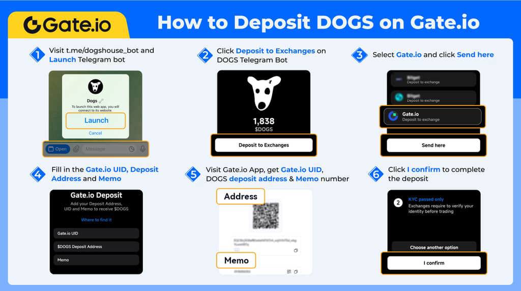 1. Klik untuk mengakses bot Telegram DOGS: http://t.me/dogshouse_bot 2. Di beranda Bot Telegram DOGS, klik "Deposit to Exchanges". 3. Pilih "Gate.io" dan klik tombol "Kirim di sini". 4. Masukkan UID Gate.io, alamat deposit, dan Memo Anda. 5. Kunjungi Aplikasi Gate.io untuk mendapatkan UID Gate.io, alamat deposit DOGS, dan Memo Anda. 6. Klik "Saya konfirmasi" untuk menyelesaikan deposit.