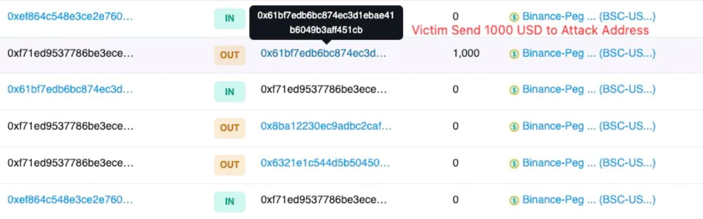 2. A hacker transfers 0 USDT to the victim via the attack address