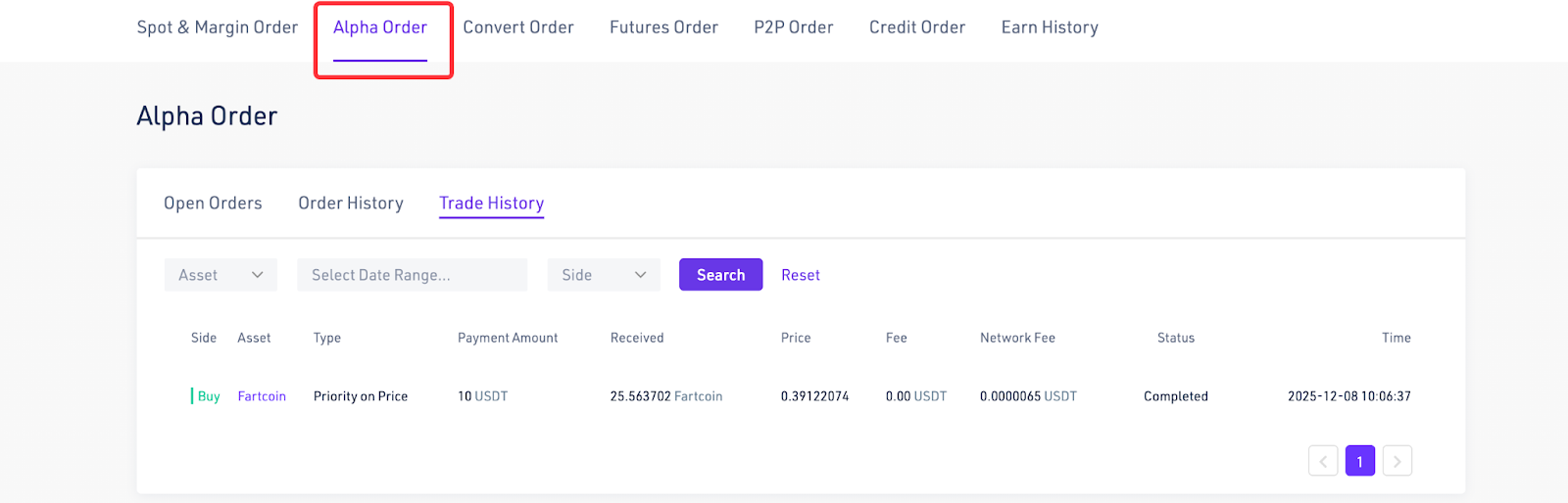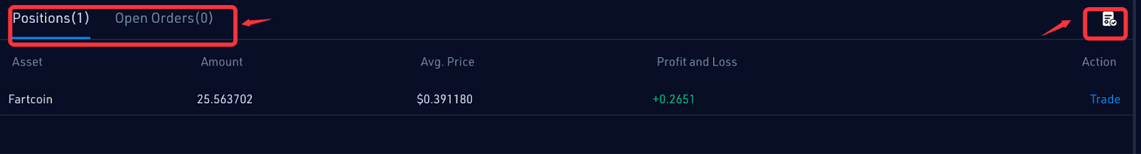 - You can check your token holdings and completed/pending orders in "Positions," "Open Orders," and "Alpha Orders" at the bottom of the page.