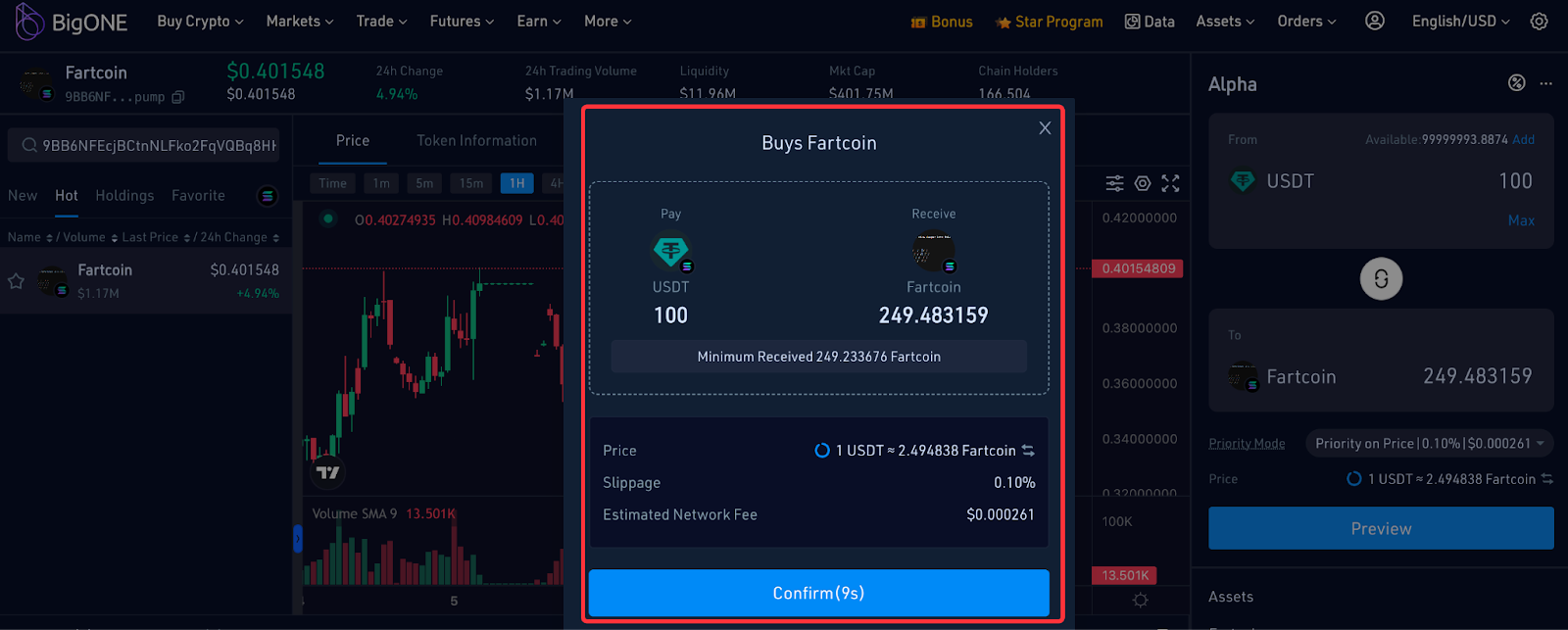 - Clicking "Preview" allows you to view the order information, including the acquisition amount, price, slippage, and estimated network fee. You have 10 seconds to confirm the order; orders that are not confirmed within this time will revert to a new quote. Most submitted orders are executed quickly, but some may fail due to price fluctuations.