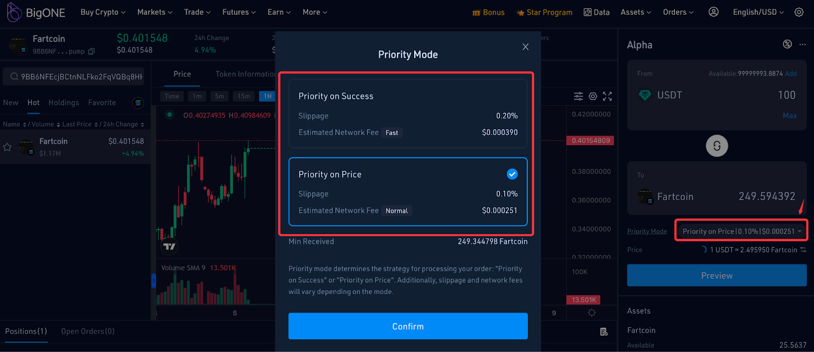 - When placing an order, you can switch the priority mode based on your needs. The priority mode determines the strategy for handling your order: "Priority on Success" or "Priority on Price." Additionally, slippage and network fees may vary depending on the chosen mode.