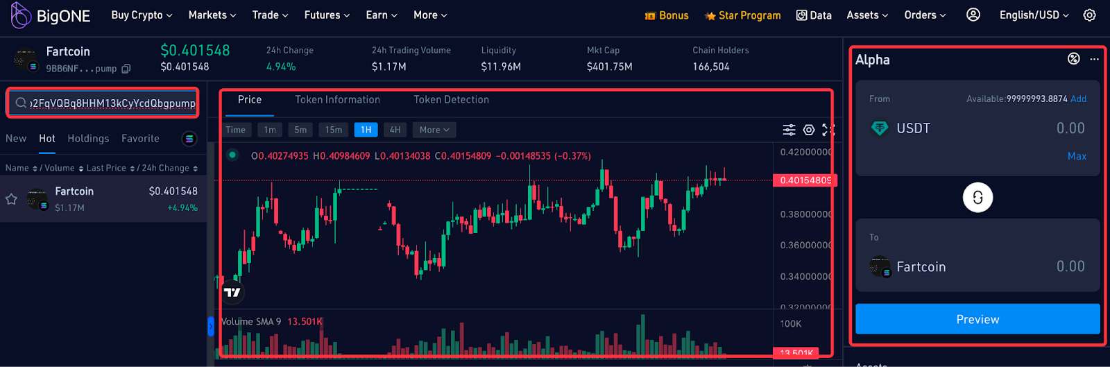 - You can search for Alpha tokens by entering the token name or token contract address in the search box. Each Alpha token has an exclusive detail page that displays a real-time price chart, token information/detection, and trading options.