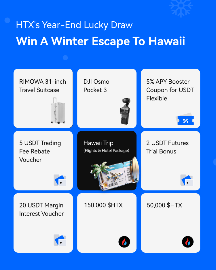 - The physical rewards, including the Hawaii trip (the flights and hotel package), the RIMOWA 31-inch travel suitcase, and the DJI Osmo Pocket 3, will be converted into and distributed as equivalent $HTX tokens.