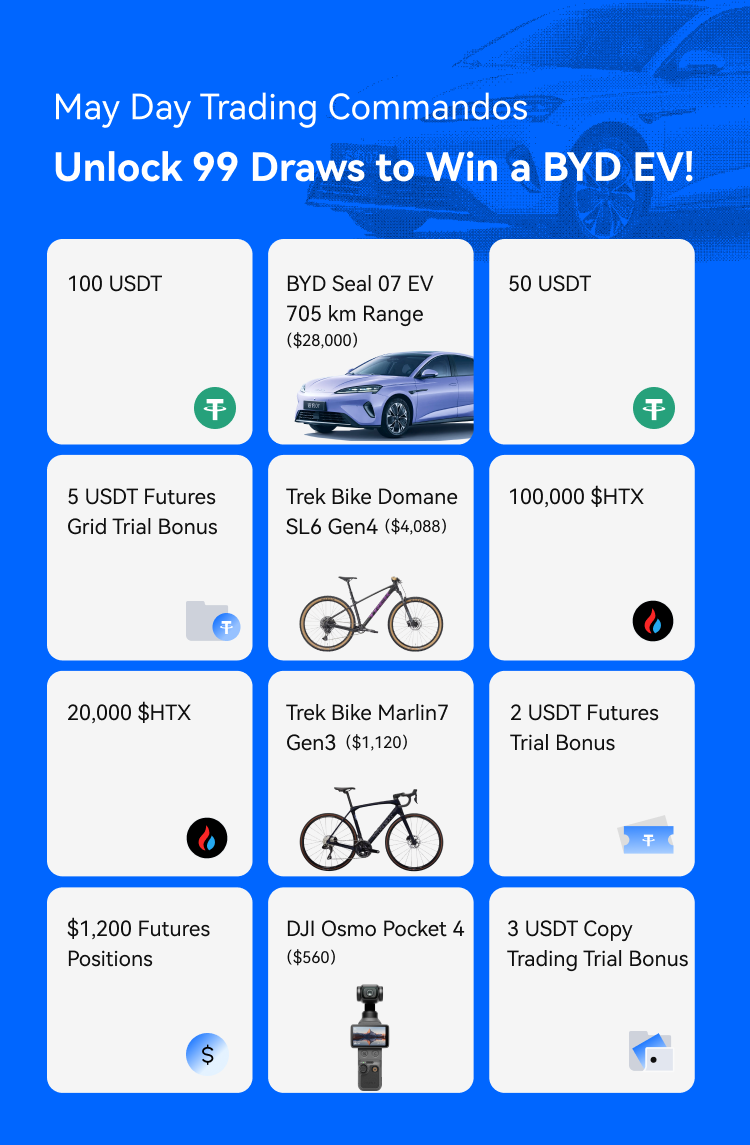 Why fight the crowds at tourist traps when you could be harvesting gold in the futures market? HTX is excited to roll out the "May Day Trading Commandos" event. Every trade is an opportunity for a lucky draw entry, and 99 consecutive entries are waiting for you! From a BYD Seal 07 EV and a high-end Trek bike to a DJI Osmo Pocket 4, a massive prize pool is ready for the elite traders in the market.