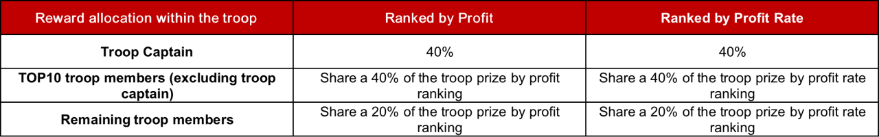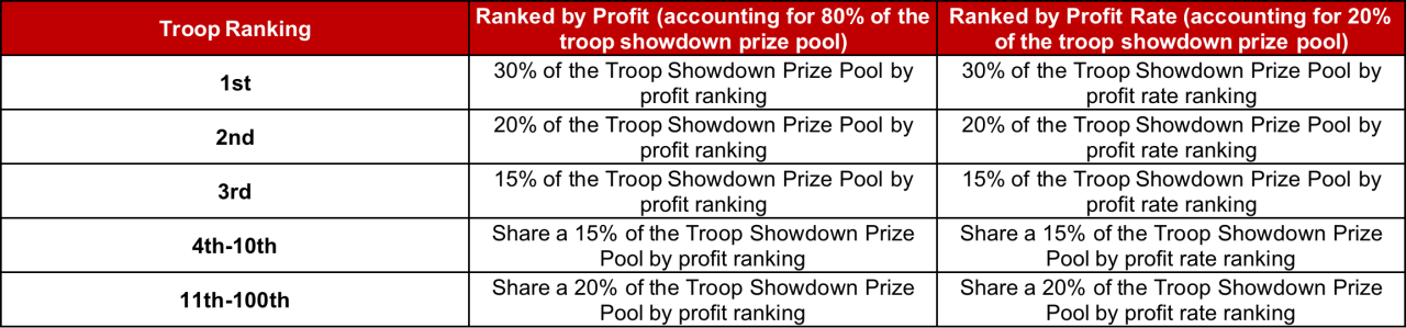 (2) During the competition, those who get troop showdown rewards ranked according to the amount of profit and profit rate will be distributed within the troop according to the following rules: