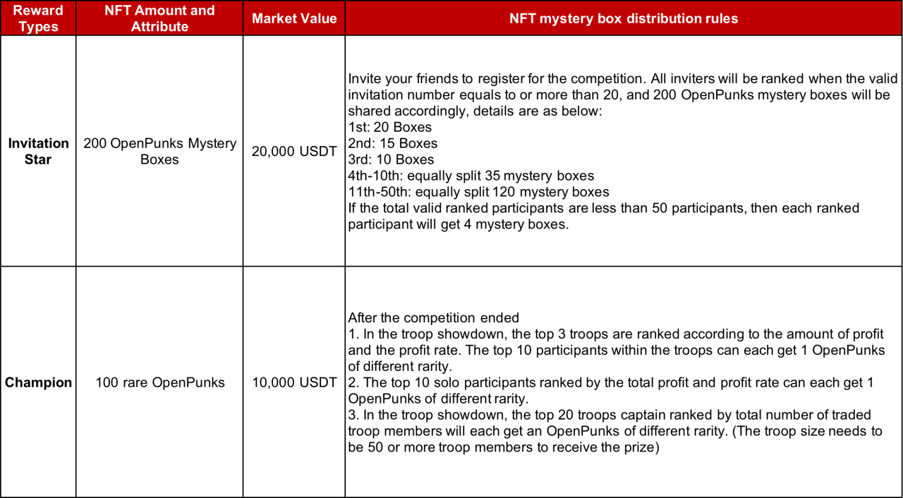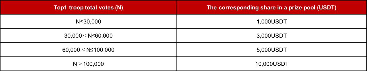 Reward 1: During the competition, Captain of each troop can invite friends to join his/her troop via event link and both Captain and the invitee who decides to join the troop will get a $10 Contract Bonus. The Contract Bonus for the captains can be redeemed once there are 5 members joining the troop. Total of $10,000 worth of Contract Bonus, first come first served.