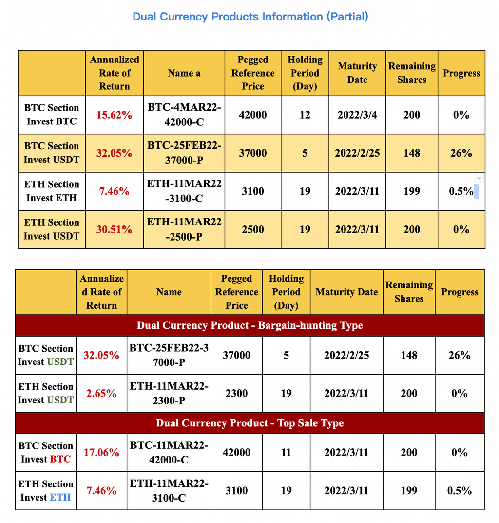 リスク警告:デュアル通貨金融商品は変動収入の元本非保証型資産管理商品であり、最終決済は決済価格とリンク価格によって決定されます。したがって、リスクは主に市場価格の高変動性にあります。ユーザーはリスクを理解した上で慎重に投資することをお勧めします。 一般的に、決済日の満期が短いほど、年率収益は低くなります。また、リンク価格が高い場合、年率収益は相対的に低くなります。リスク許容度に応じて異なる商品を選択できます。