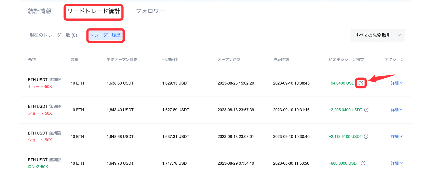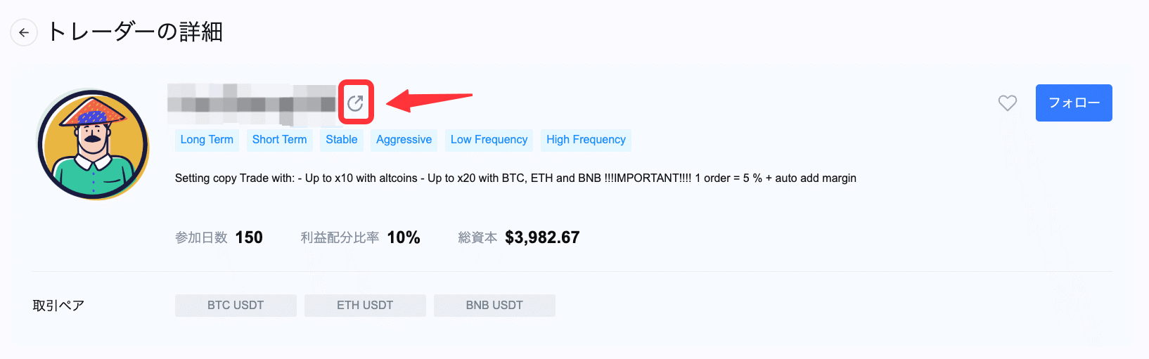 操作方法:コピートレードページからトレーダーの詳細にアクセスします。