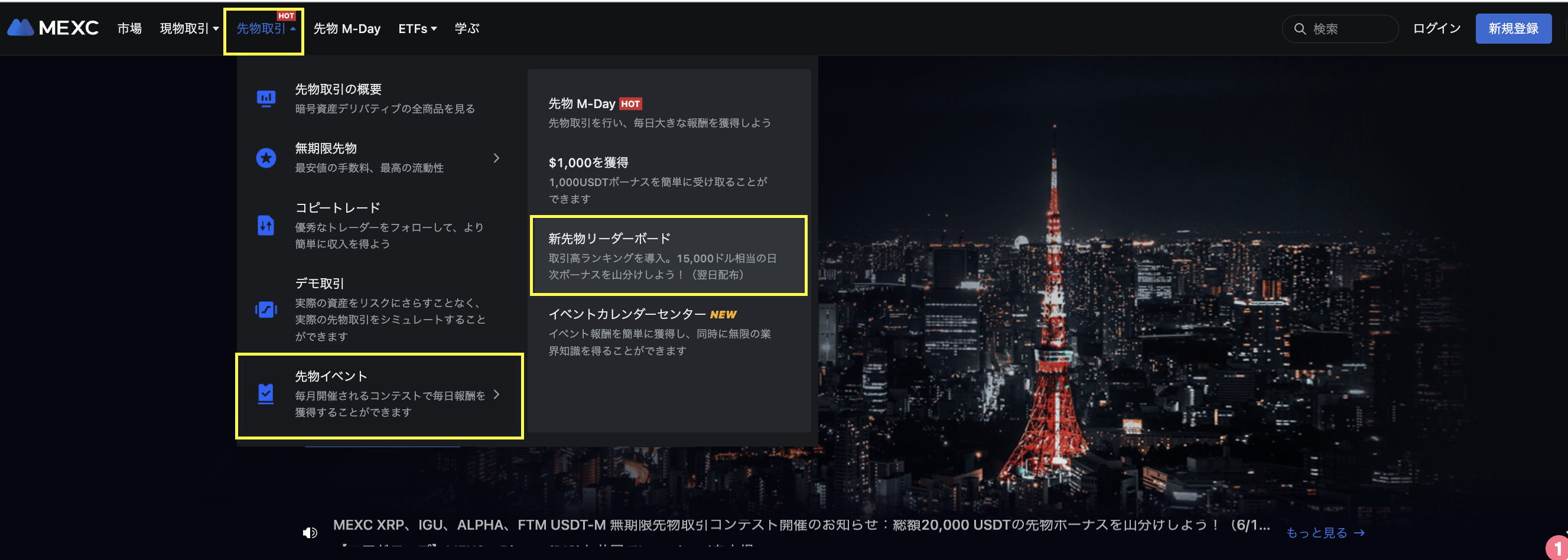 ウェブ:MEXCホームページ(https://www.mexc.com/ja-JP)にアクセスし、ナビゲーションバーの「先物取引」をクリックし、「先物リーダーボード」をクリックします。