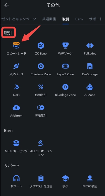 コピートレードの確認方法:APP>その他>トレード>コピートレード
