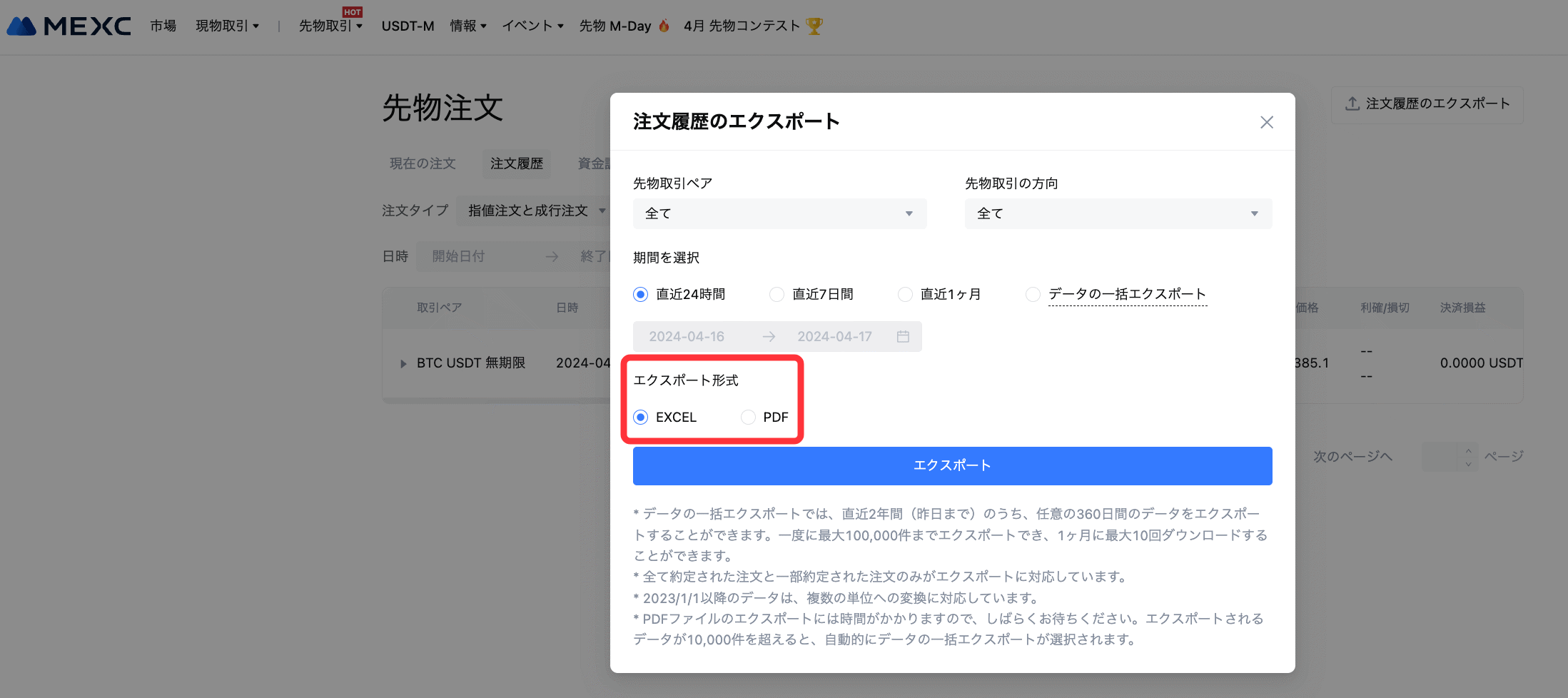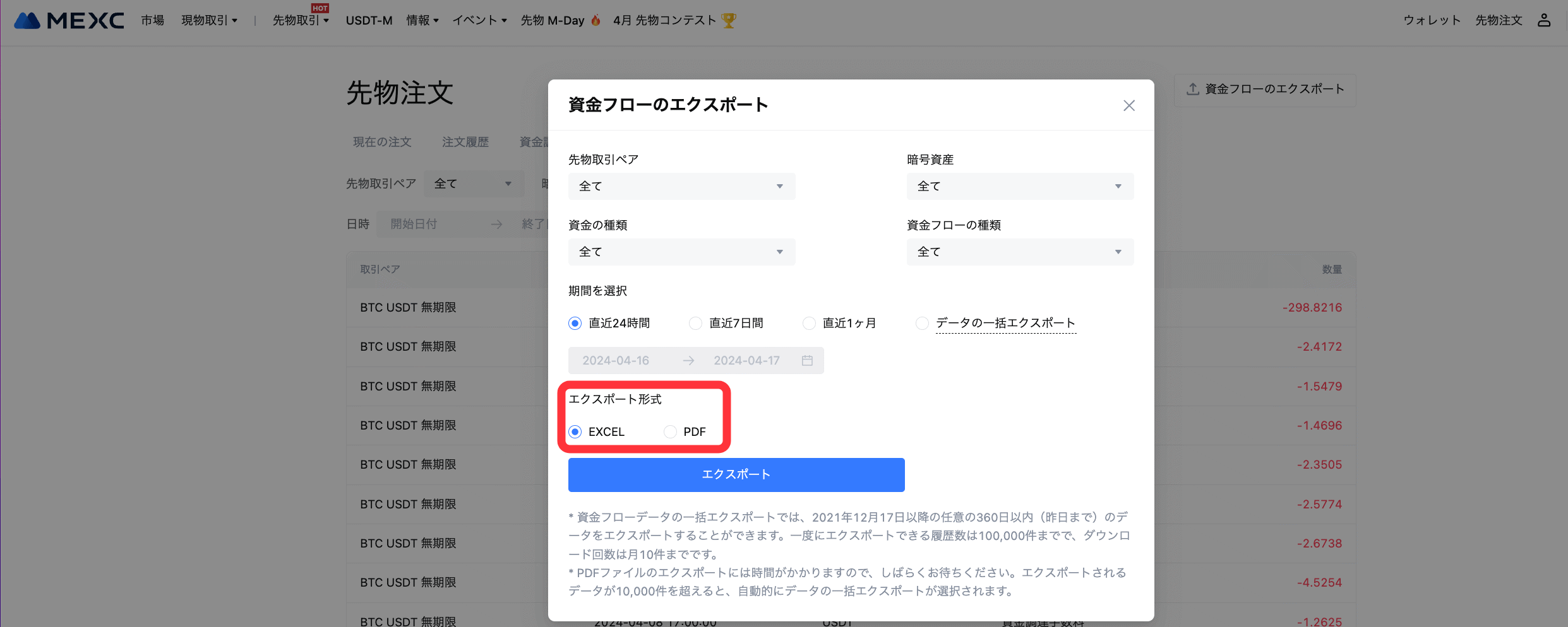 MEXC先物の注文履歴および資金フローのPDFエクスポート機能が実装されました(2024年4月17日)