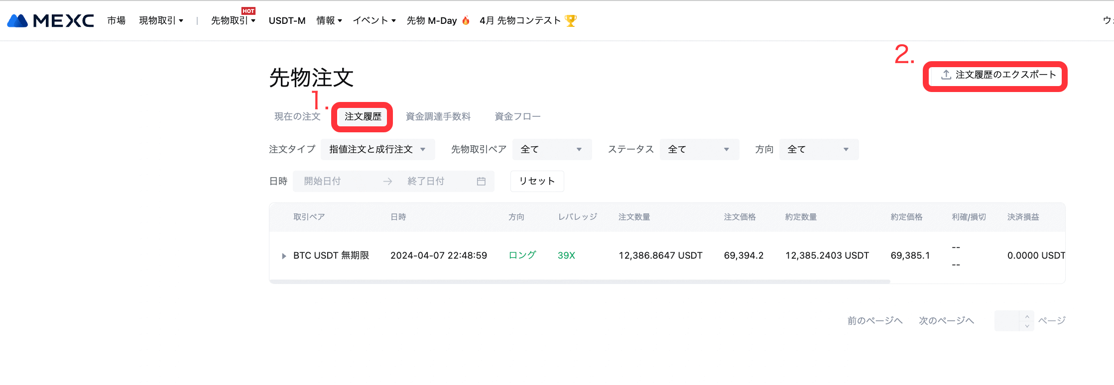 MEXCの公式ウェブサイトのホームページにアクセスし、ログイン状態を保持したまま、[注文履歴]-[先物取引]をクリックして先物注文画面に入ります。その後、[注文履歴]-[注文履歴のエクスポート]または[資金フロー]-[資金フローのエクスポート]をクリックすると、固定フォーマットのPDF履歴データファイルが生成されます。