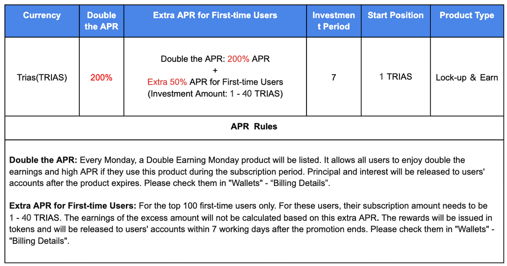 Earning Accrual Rules: Interest begins to accrue at 1:00 AM UTC the next day after tokens are lockedEarnings Calculation: Based on the specified APREarnings Distribution: Distributed when the product expiresUnlocking Rules: Unlocked when the product expiresWhen to receive: Assets will be received immediately after they are unlocked.