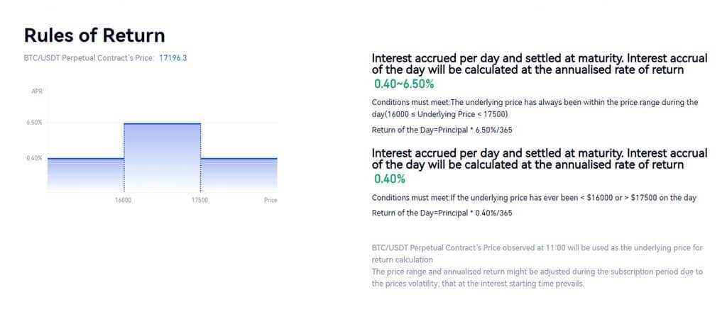 - During the observation period, if the price of the target asset stays within the price range (that is, hit the range), the user can obtain a high APR - 6.5% (Guaranteed APR < APR within the price range).