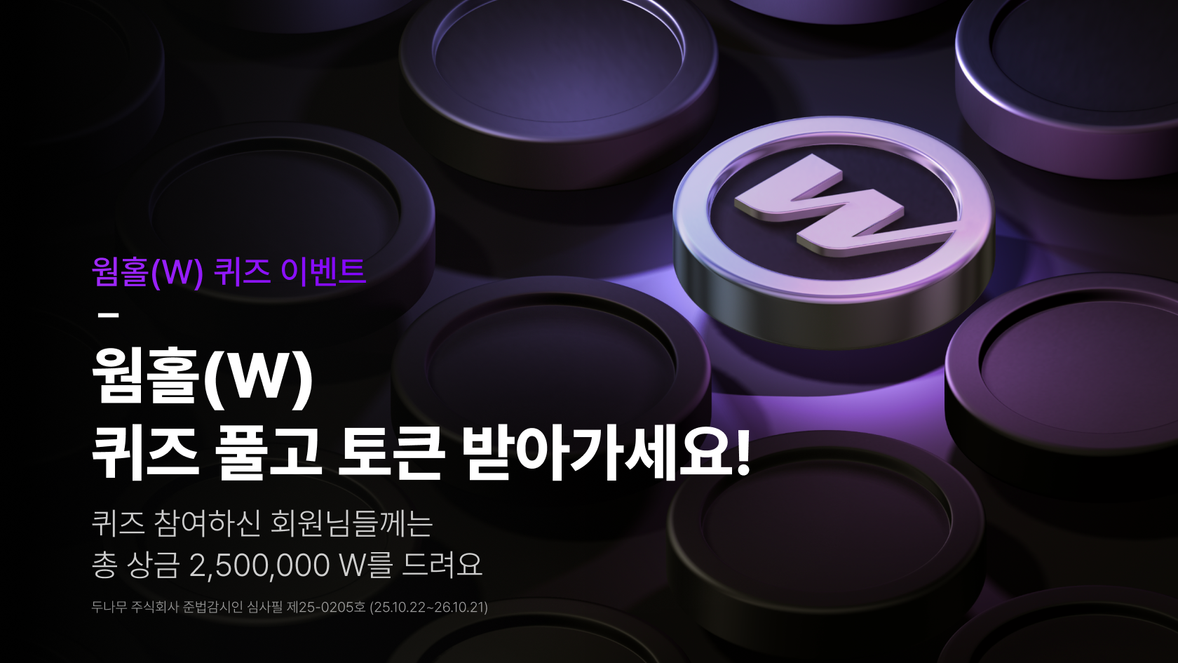 웜홀(W)에서 회원님들을 위한 퀴즈 이벤트를 진행합니다. 프로젝트에 대해 알아보고 토큰도 받아가세요!정답을 모두 맞히신 선착순 50,000명에게 총 2,500,000 W를 나눠드려요!*본 이벤트는 프로젝트 측 요청으로 진행하는 이벤트입니다.