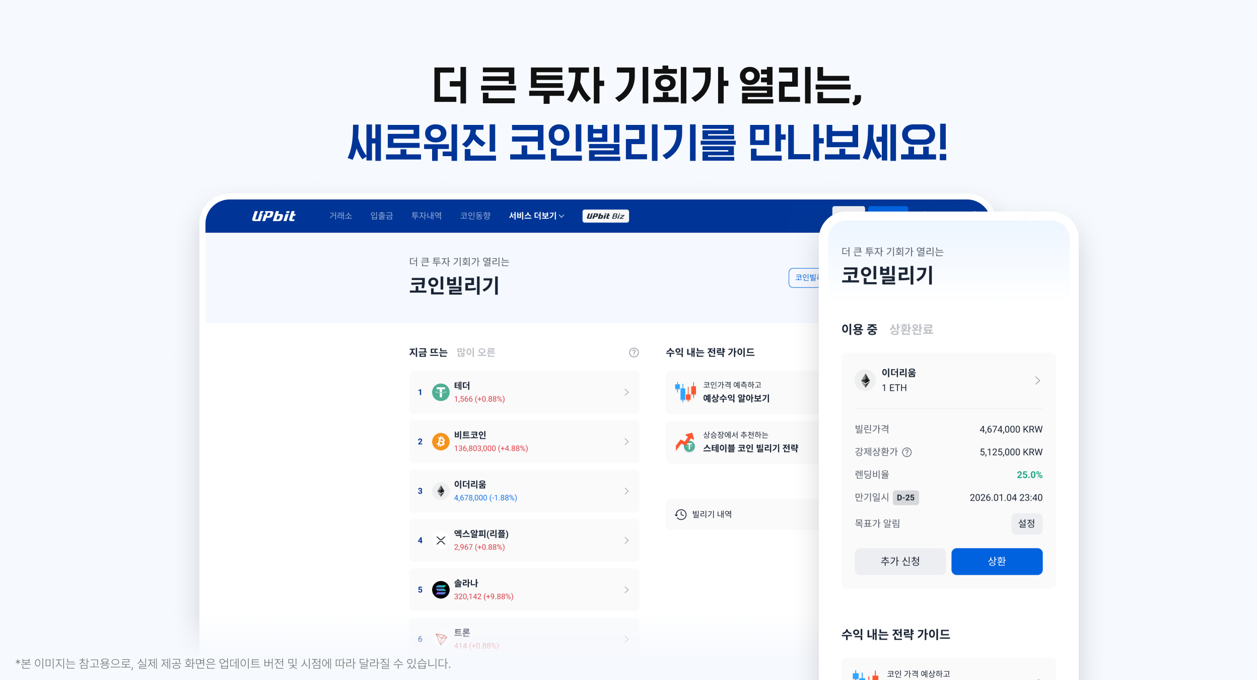 - 모바일 앱은 최신 버전으로 업데이트한 후 정상적으로 이용할 수 있습니다. 하위 버전 이용 시 강제상환 사전 알림, 투자내역 내 코인빌리기 담보자산 표기, 코인빌리기 서비스 내 목표가 알림 등 일부 기능이 정상적으로 동작하지 않을 수 있습니다.