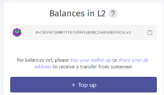 - Step 2 Click "Top up" and deposit ETH on zkSync. You can deposit tokens from your Ethereum wallet( Bridge from L1 network) to zkSync or buy crypto with fiat currency.