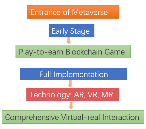 The current application of metaverse is basically in the game field, though the concept covers a wide range. In the early stage, most of the metaverse concepts are around the game industry and attract a lot of players. In these kinds of games, players can purchase ownership of items in the virtual world or mint their own NFTs, which can be sold in the marketplace. Most of the play-to-earn games have the feature above. These games can be seen as prototypes of the early meta-universe. With the development of technology, after the full implementation of the meta-universe, virtual-real will be added to the games and the game platform will include the most comprehensive virtual-real interaction.