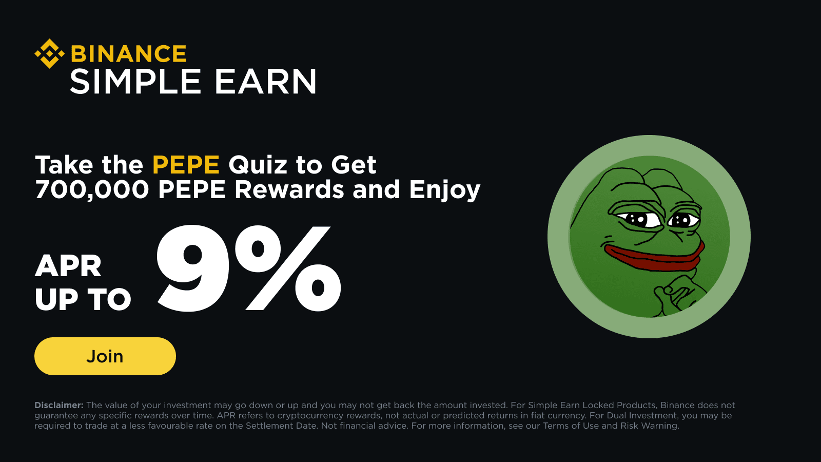 PEPE Simple Earn: conclua um quiz para ganhar 700.000 PEPE em recompensas e aproveite até 9% de APR Bônus por Nível!