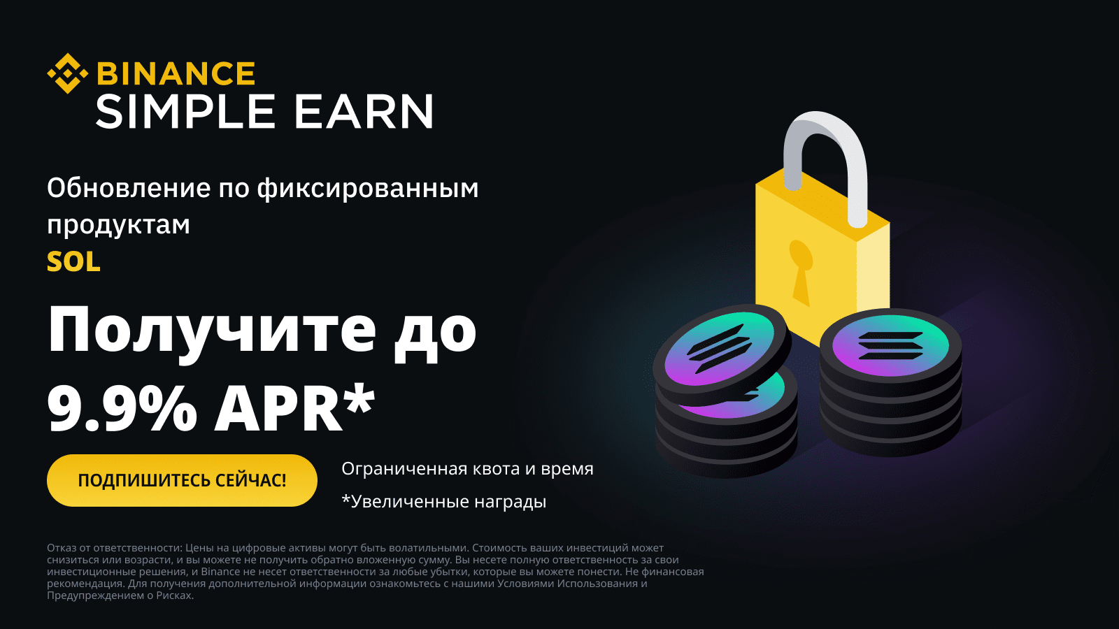 Binance Simple Earn объявляет о запуске продуктов с фиксированными условиями для SOL. Оформляйте подписку на продукты Simple Earn с фиксированными условиями для SOL, чтобы заработать награду в форме APR до 9,9%!