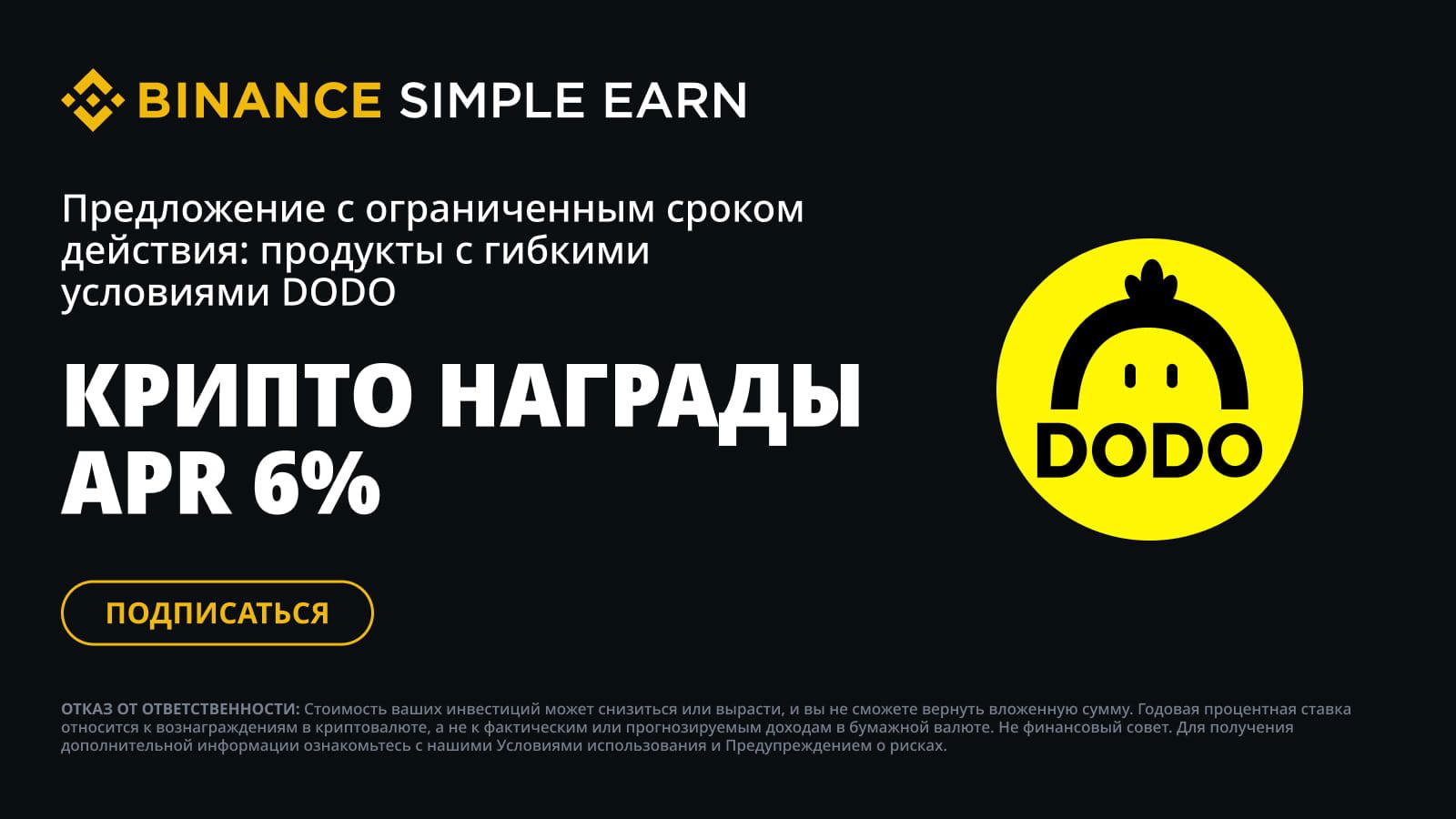 Платформа Binance Simple Earn объявляет о запуске промоакции для токенов DODO (DODO) и продуктов Simple Earn с гибкими условиями. Оформите подписку на продукты Simple Earn с гибкими условиями для токенов DODO во время промоакции, чтобы получить доступ к эксклюзивной бонусной многоуровневой APR в размере 6% в дополнение к вознаграждениям в форме APR в режиме реального времени.