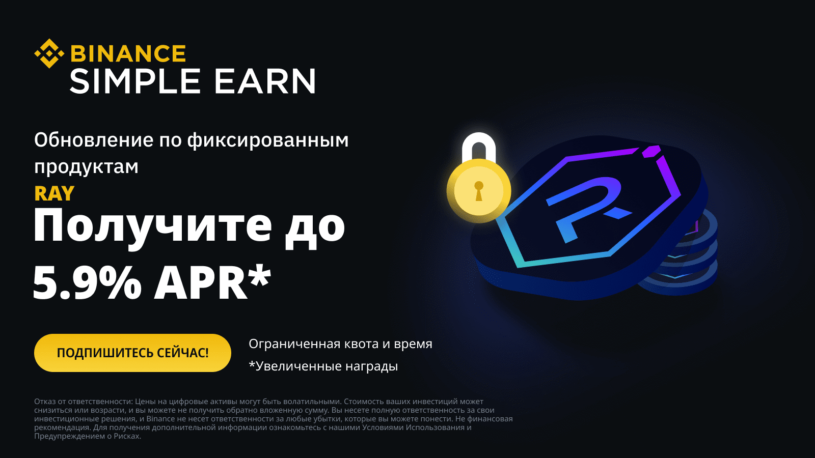 Платформа Binance Simple Earn предлагает продукты для RAY с фиксированными условиями. Оформляйте подписку на них с 04.01.2024 15:00 (МСК) и получайте вознаграждение в виде APR до 5,9%.