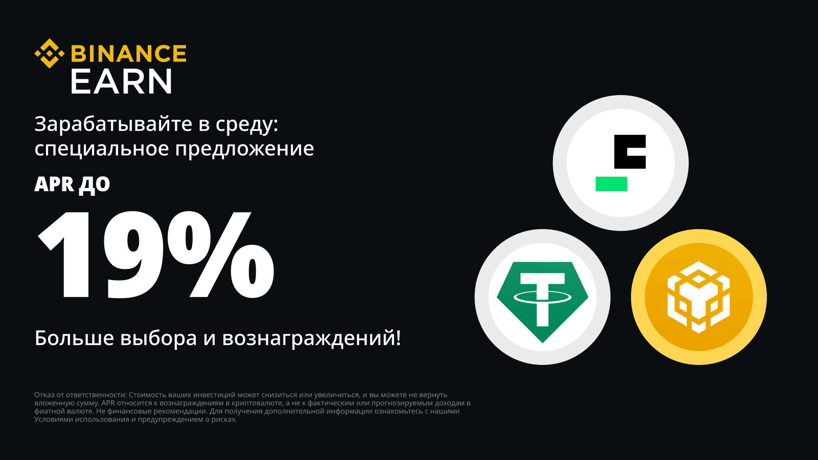 Каждую среду Binance Earn добавляет новые интересные предложения для пользователей. Следите за новостями промоакции «Зарабатывайте в среду» и узнайте, как получать вознаграждения с помощью Simple Earn, стейкинга ETH, бивалютных инвестиций и других сервисов.