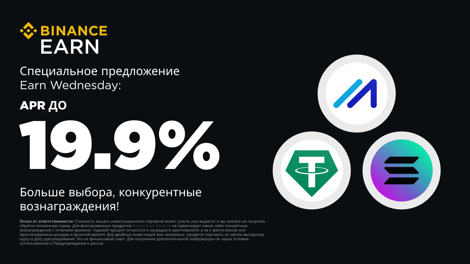 Каждую среду Binance Earn добавляет новые интересные предложения для пользователей. Следите за новостями промоакции «Зарабатывайте в среду» и узнайте, как получать вознаграждения с помощью Simple Earn, BNB Vault, стейкинга ETH, бивалютных инвестиций и других сервисов.