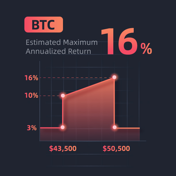 If during the entire lifetime of the shark fin product, BTC price always stays within the per-specified range ($43,500-$50,500), investors will get a return up to 16% APR. (The closer to the $50,500 level, the higher the return rate).