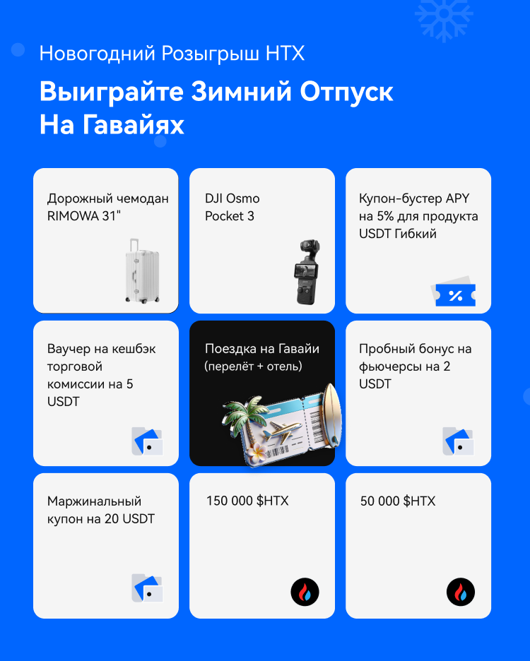 Отпразднуйте сезон праздников вместе с Новогодним розыгрышем HTX! Вас ждёт незабываемый опыт и впечатляющие призы, включая главный приз - поездку на Гавайи с авиабилетами и проживанием, чтобы сбежать от зимнего холода. И это ещё не всё: вы также можете выиграть стильный чемодан RIMOWA или DJI Osmo Pocket 3.