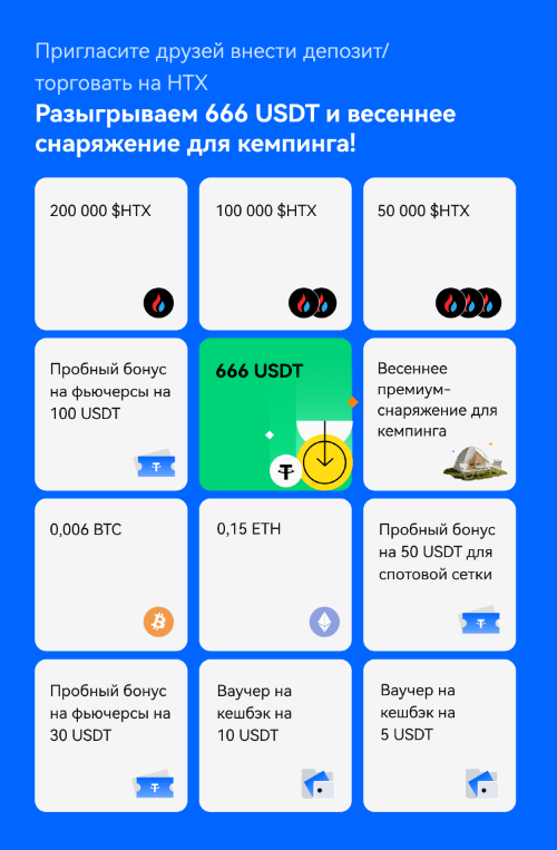 $HTX, $BTC, $ETH, 666 USDT и весеннее снаряжение для кемпинга ждут вас. Чем больше приглашенных, тем больше у вас попыток. Испытайте свою удачу прямо сейчас!