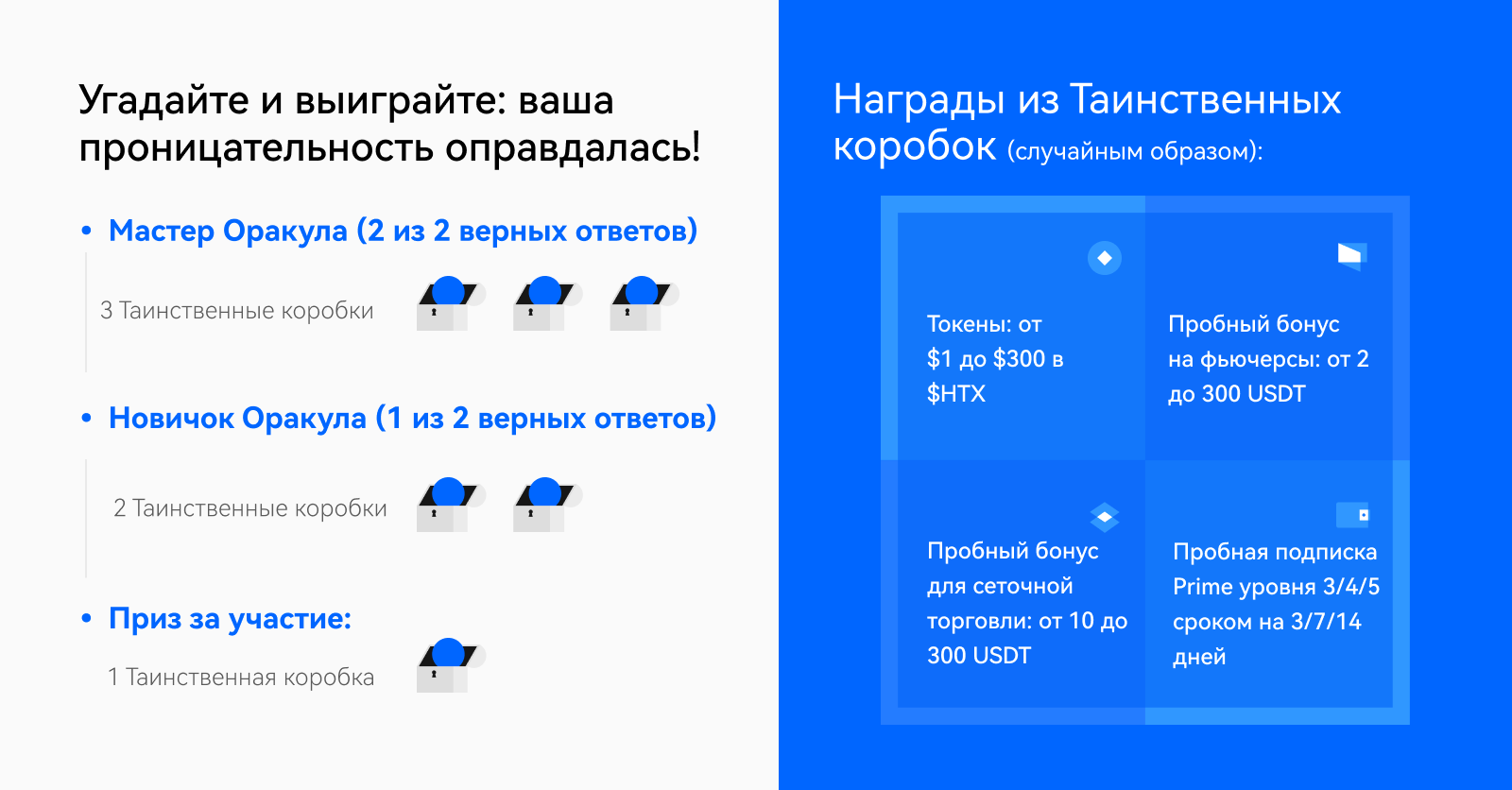 - Награды в виде $HTX будут зачислены на аккаунты победителей на HTX в течение 14 рабочих дней после окончания мероприятия. Если победители не получили свои награды по истечении 14 рабочих дней, пожалуйста, обратитесь в нашу круглосуточную онлайн-службу поддержки или по электронной почте [email protected] за помощью.