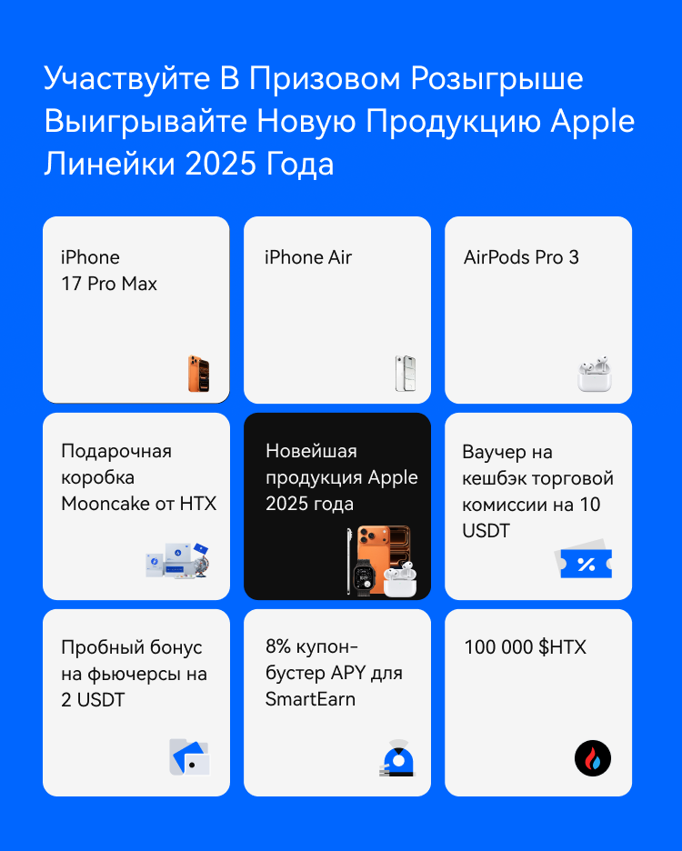 HTX рада объявить о старте специального осеннего розыгрыша призов, который продлится ограниченное время. Выполните несколько простых заданий, чтобы получить шанс выиграть совершенно новый набор продукции Apple 2025 года.