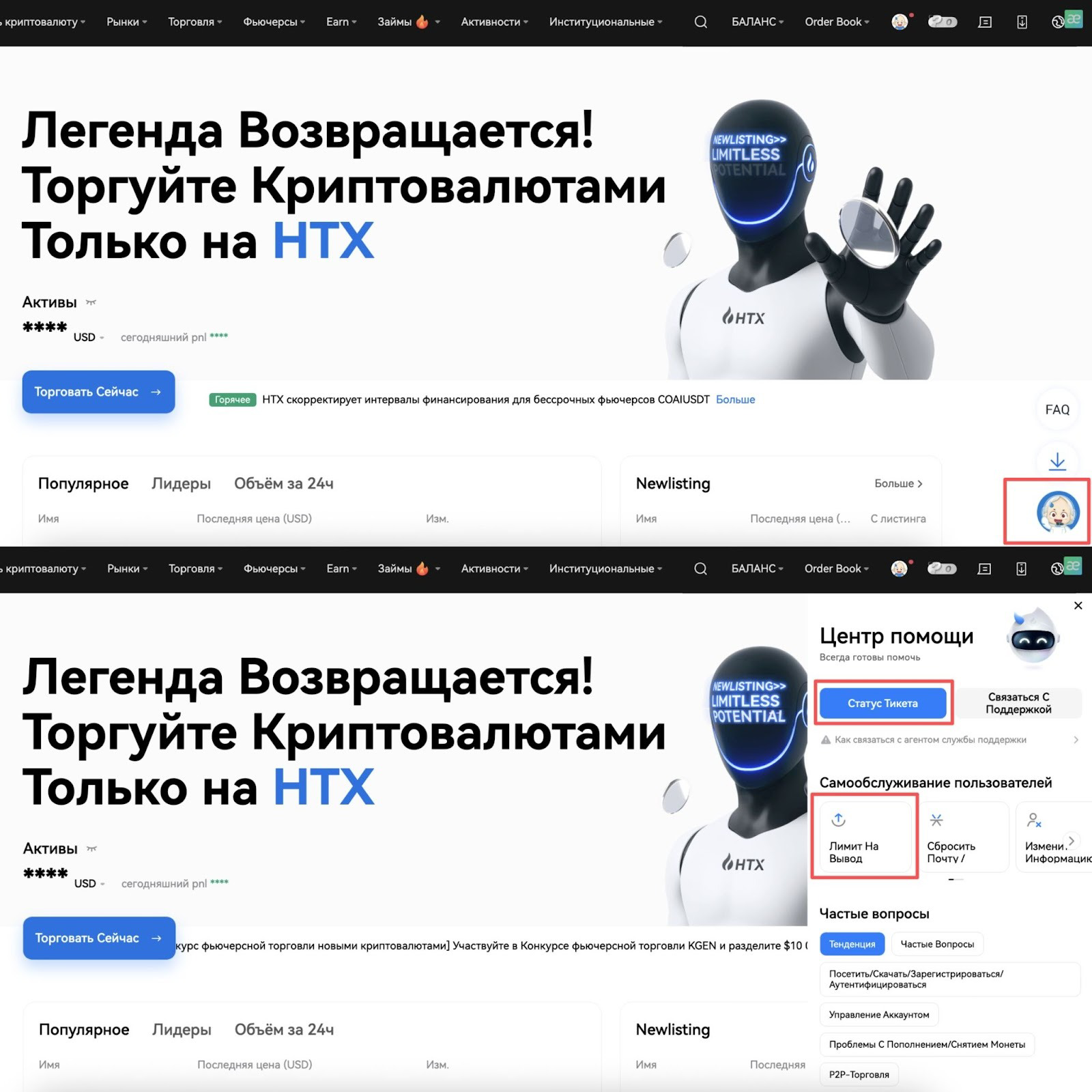 Войдите в свою учетную запись на HTX через приложение или официальный веб-сайт, перейдите в раздел [Поддержка] → [Самообслуживание пользователей] → [Лимит на вывод], заполните необходимую информацию и отправьте запрос на получение помощи. Наша команда службы поддержки ответит в течение 24 часов и будет держать вас в курсе хода выполнения вашего запроса.