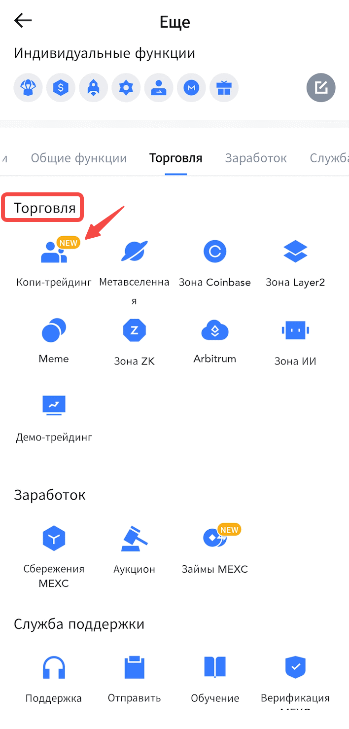 Как зайти в копи-трейдинг: Приложение > Еще > Торговля > Копи-трейдинг