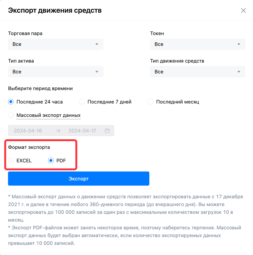 Веб-версия истории фьючерсных ордеров и истории потока капитала теперь поддерживают формат экспорта PDF.