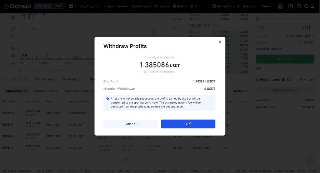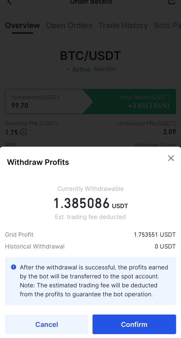 3. Para çekme açılır penceresinde, uygun karlarınızı anında spot hesabınıza aktarmak için 'Onayla'ya tıklayın. Devam eden bot işlemleri için küçük bir kısım düşülecektir, bu nedenle çekebileceğiniz miktar toplam grid karlarınızdan biraz daha düşük olacaktır.