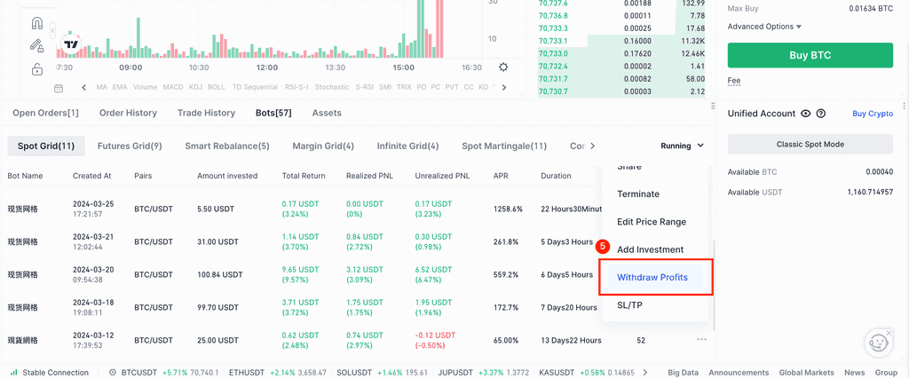 Artık, spot grid işlemleriniz aktifken kazançlarınızı anında çekebilir ve stratejinin tamamlanmasını beklemenize gerek kalmaz. Bu, varlıklarınızı daha verimli bir şekilde yönetme esnekliği sunar ve piyasa koşullarına göre zamanında ayarlamalar yapmanıza olanak tanır.