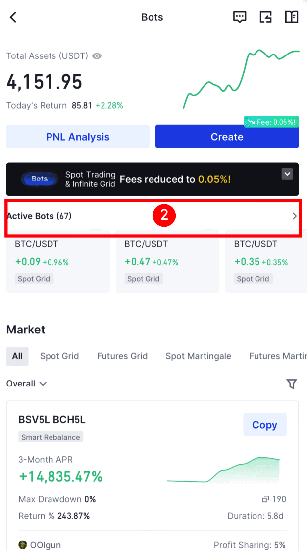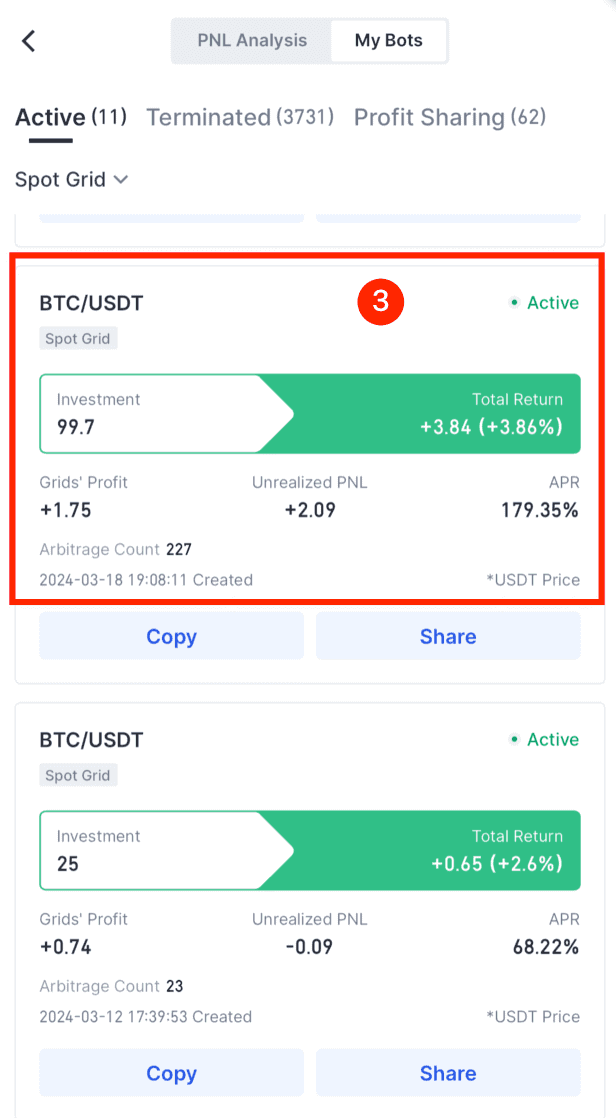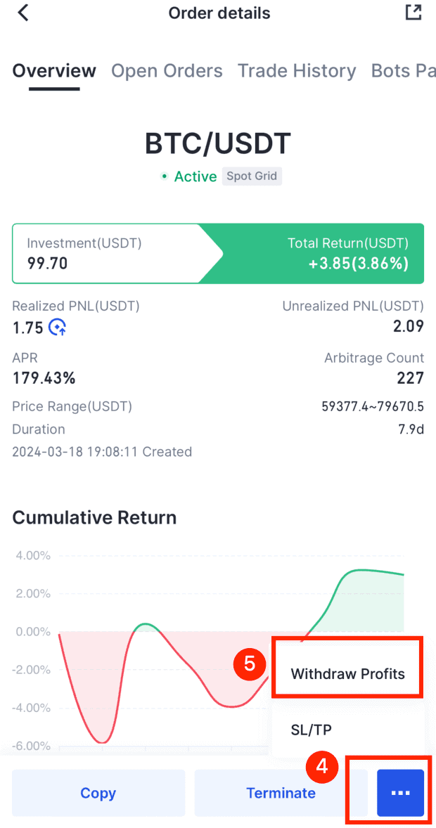 **2. **[Aktif botlar]'a dokunun, kullanımda olan Spot Grid botunu seçin ve sipariş ayrıntılarını girin. Daha fazla seçenek altında 'Kar Çek'i seçin. Unutmayın, botunuz sıfırın üzerinde bir paylaşım oranına sahip bir kopyaysa, kar çekimi henüz mevcut değildir.