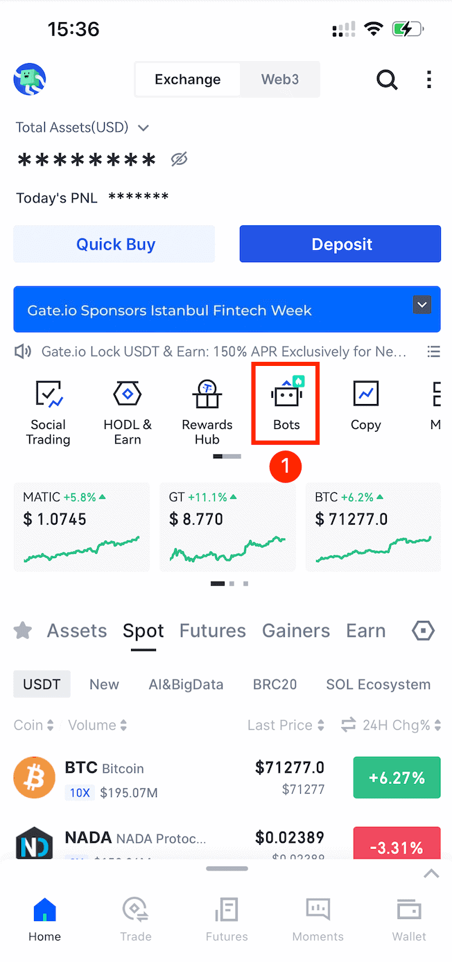 **1. **Gate APP'yi açın ve ana sayfaya girmek için ana ekrandan [Trading Robot]'u seçin.