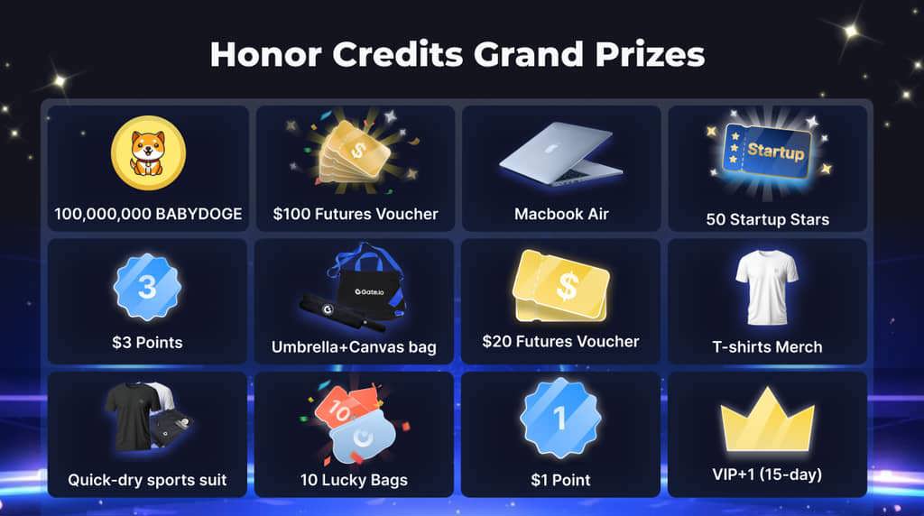 Gate.io Onur Kredileri Büyük Çekilişi başlıyor! Onur kredilerinizi kullanarak harika ödüller kazanın! Ödüller arasında birbirinden şık ürünler, MacBook Air, VIP 1 yükseltmesi, Startup yıldızları, Vadeli İşlem Kuponları, Point'ler, Tokenler, Sürpriz Çantalar ve çok daha fazlası bulunuyor!