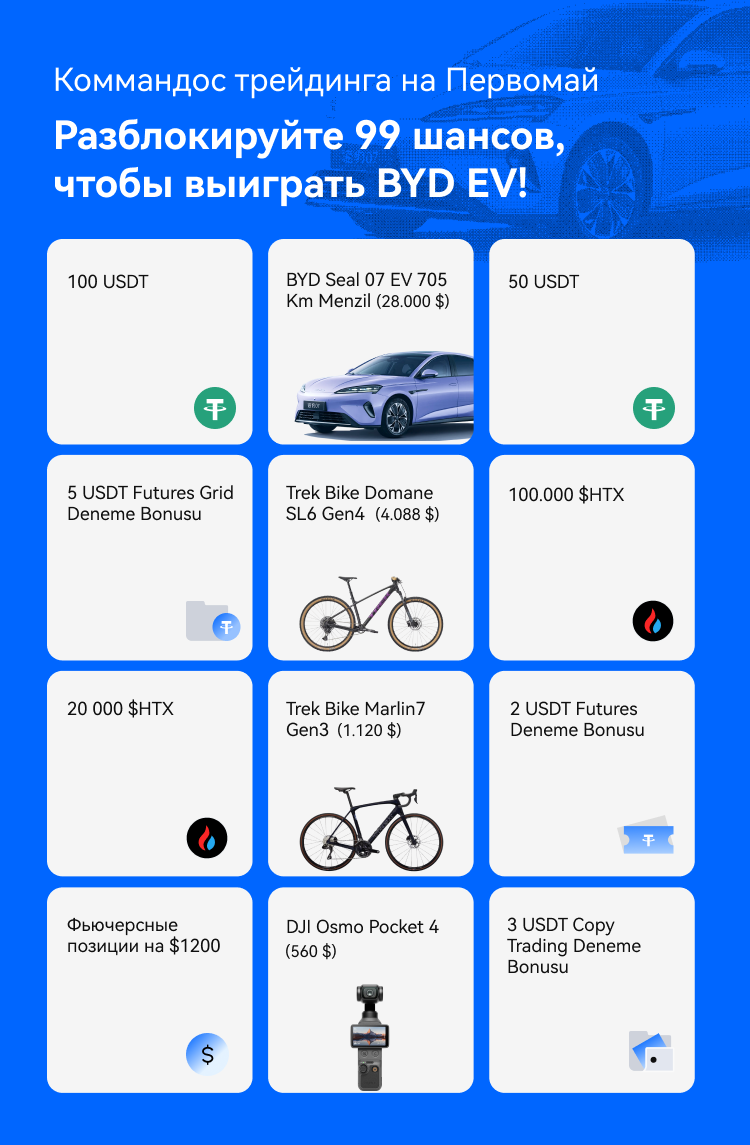 - Yeni BYD Seal 07 EV, Trek bisiklet ve DJI Osmo Pocket 4 gibi fiziksel ödüller, eş değerde $HTX tokenler olarak dağıtılacaktır. Ödüller, etkinlik sona erdikten sonra 14 iş günü içinde HTX hesabınıza yatırılacaktır. Kazananlar 14 iş günü sonra ödüllerini almamış olurlarsa, yardım için 7/24 çevrimiçi Kullanıcı Destek ekibimizle iletişime geçebilir veya [email protected] adresine e-posta gönderebilirler.