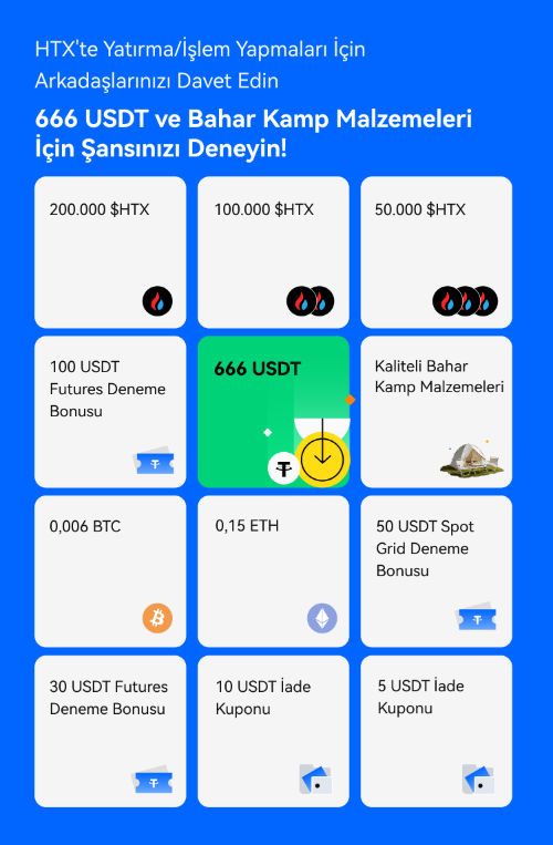 $HTX, $BTC, $ETH, 666 USDT ve Bahar Kamp Malzemeleri sizi bekliyor. Ne kadar çok davetli, o kadar çok şans hakkı demek. Şansını şimdi dene!
