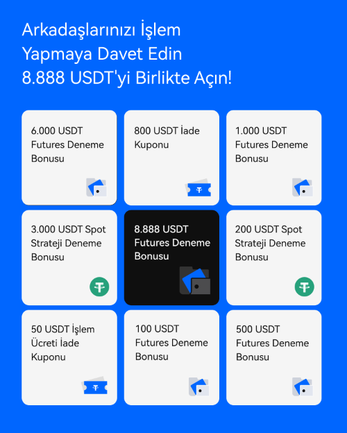 “Arkadaşlarını İşlem Yapmaya Davet Et Yarışması” etkinliğini başlatmaktan heyecan duyuyoruz! Mevcut kullanıcıları yeniden davet ediyor ya da yeni kullanıcılar davet ediyor olun, davet ettiğiniz arkadaşlarınız etkinlik süresi boyunca belirlenen işlem görevlerini tamamladığı sürece, 8.888 USDT'ye varan Futures Deneme Bonusu kazanma şansına sahip olacaksınız! Hemen harekete geçin ve arkadaşlarınızla birlikte gelirinizi artıran bir yolculuğa başlayın!