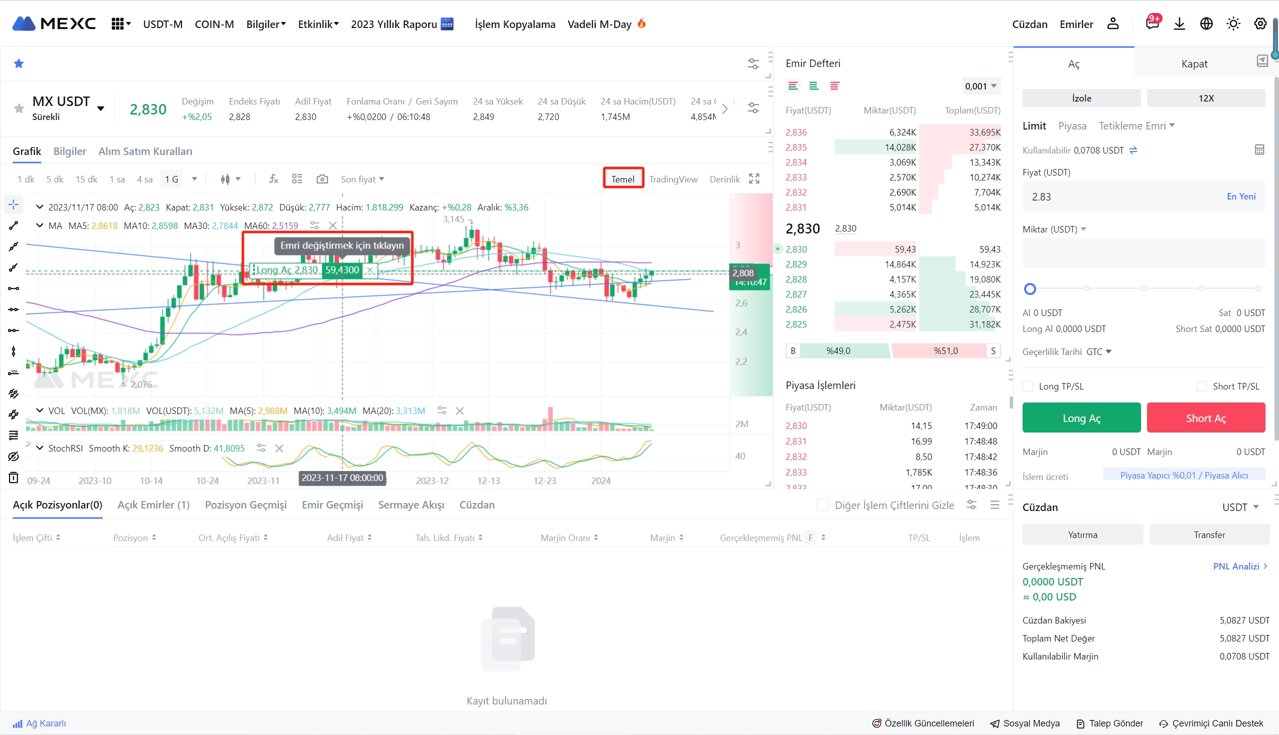 Alım satım sayfasına girebilir, mum grafiği için [Temel] seçeneğini belirleyebilir, imleci emrin üzerine getirebilir ve ilgili emri değiştirmek için talimatları takip edebilirsiniz.