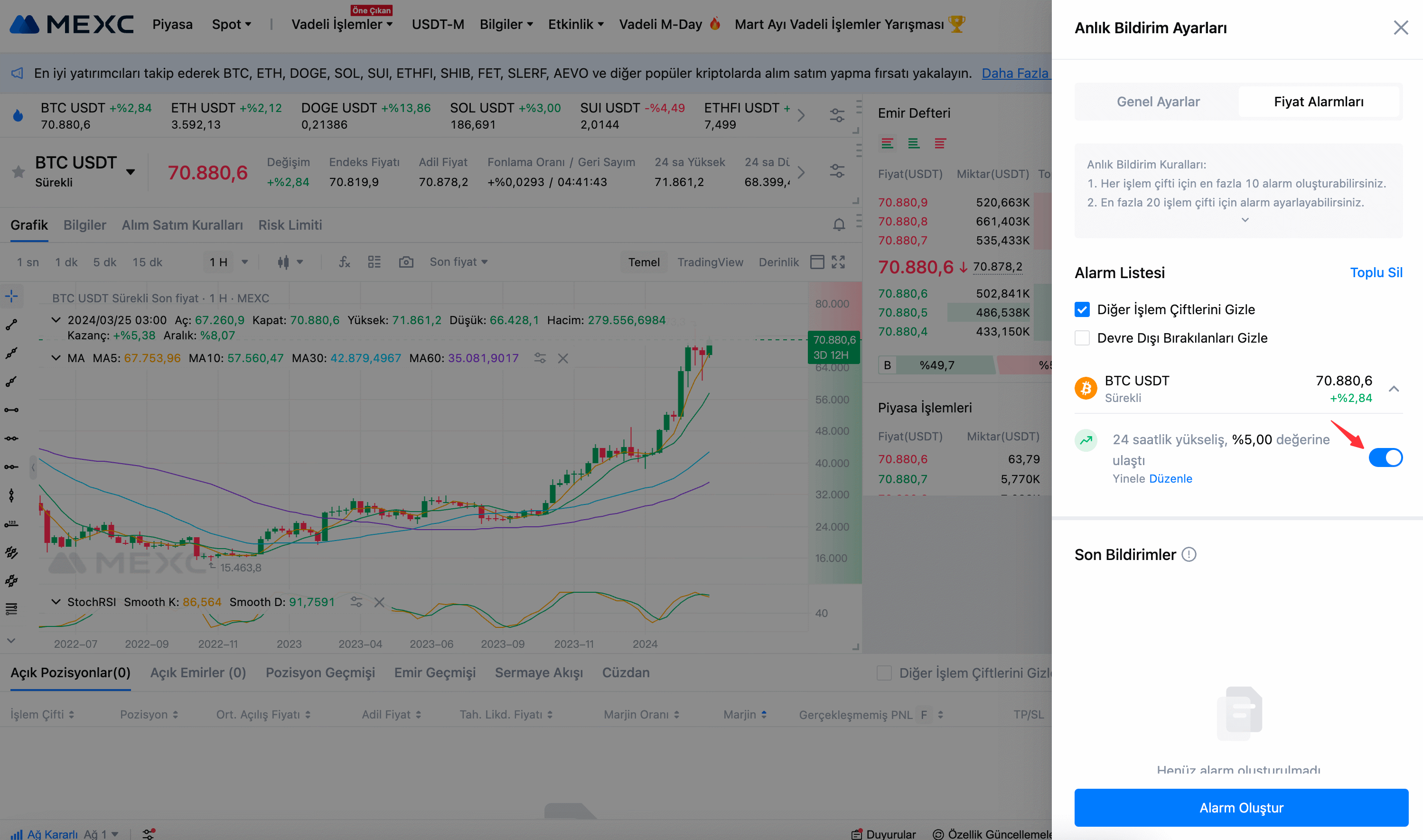 Alım satım sayfasına girebilir, zil simgesine tıklayabilir ve [Fiyat Alarmı Ayarla] seçeneğine tıklayabilirsiniz. Bu şekilde, her bir alarmı ayrı ayrı kontrol edebilirsiniz.