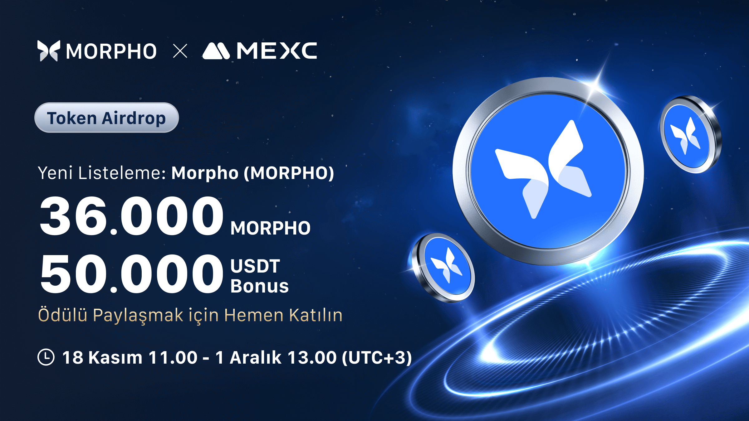[Token Airdrop] Morpho (MORPHO) Listelemesini 36.000 MORPHO ve 50.000 USDT Ödül Havuzu ile Kutluyoruz!