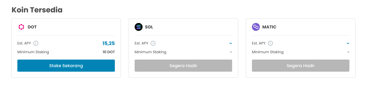 - Scroll ke bawah dan pilih koin yang diinginkan pada bagian Koin Tersedia. Pastikan saldo DOT kamu cukup dengan minimal stake 10 DOT.