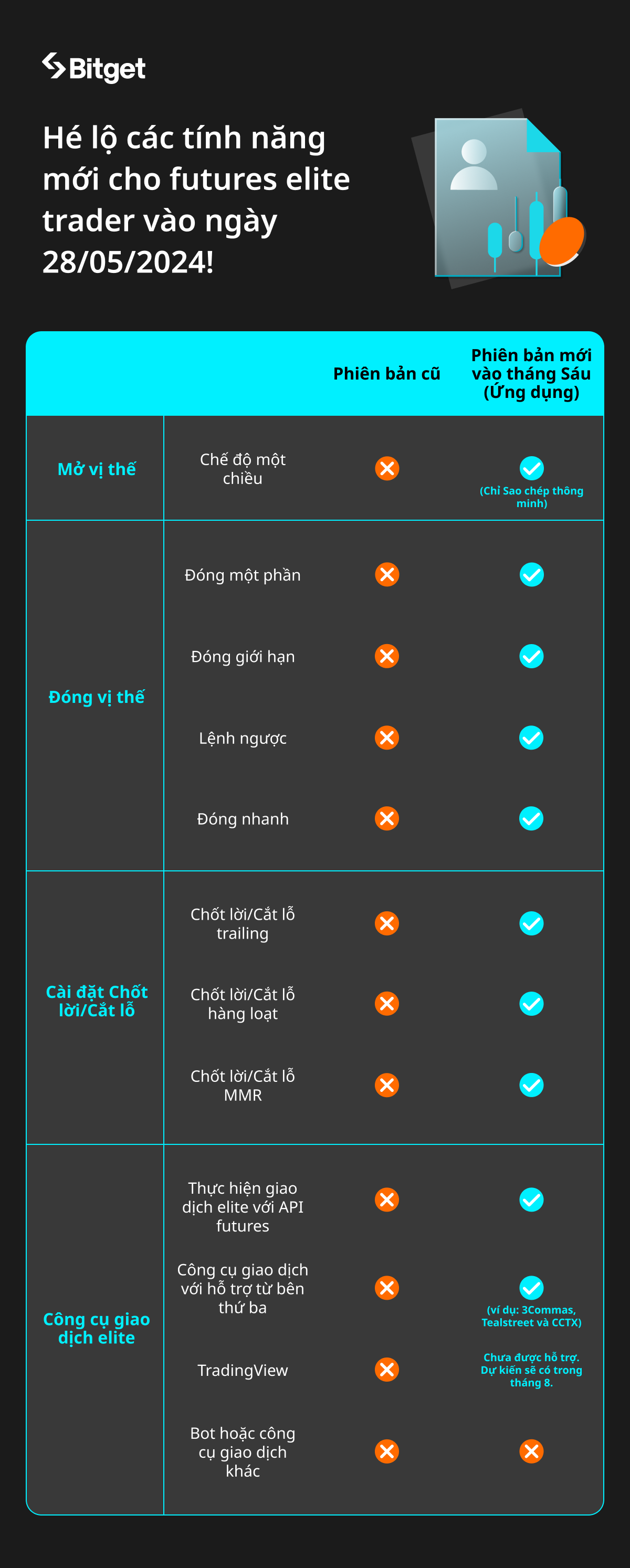 Để cảm ơn sự quan tâm và hỗ trợ không ngừng của quý người dùng dành cho giao dịch sao chép futures Bitget, chúng tôi sẽ nâng cấp hoàn toàn tính năng giao dịch elite futures vào ngày 28/05/2024 (Giờ VN) để mang đến trải nghiệm giao dịch thông minh hơn và tiện lợi hơn!