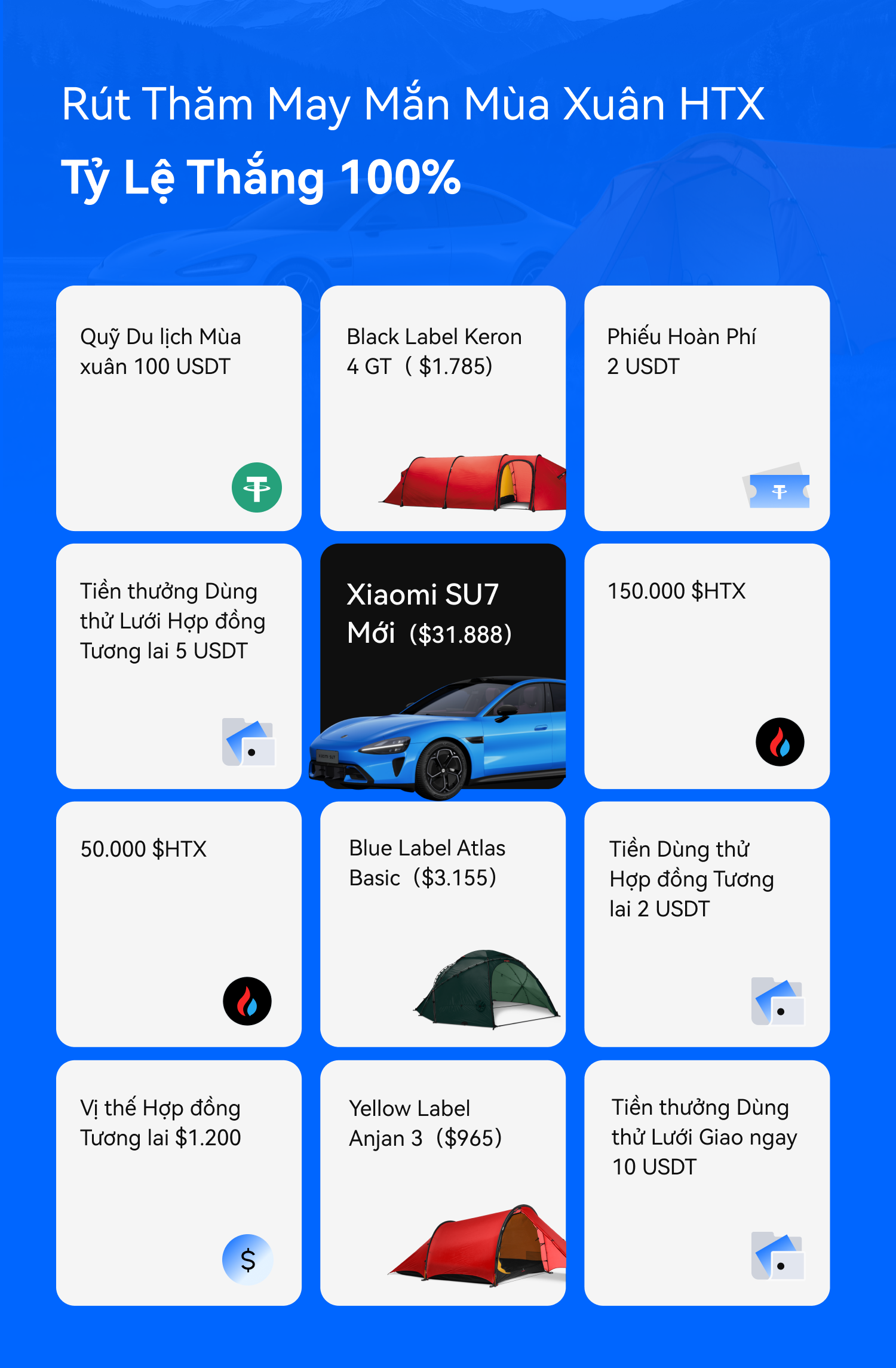 Rút Thăm May Mắn Mùa Xuân HTX: Tỷ Lệ Thắng 100% với Nhiều Giải Thưởng Cao Cấp, Bao gồm Xiaomi SU7 Mới và Lều Hilleberg Sang Trọng
